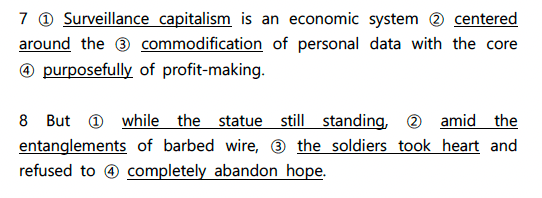 그렇기 때문에 어휘 영역의 비중이 줄어들고 또 어휘 난이도가 이전과 달리 크게 변별력이 높지 않다는 이유로 소홀해서는 안될 것 같습니다. 곧바로 어휘 영역을 뒤이어 나오는 문법 영역은 4개 가량 출제되고 있습니다.