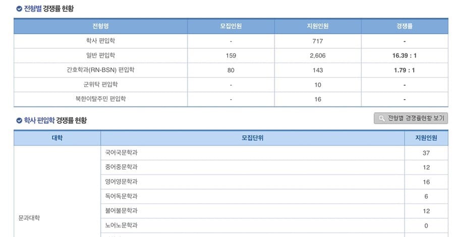 학사 편입이 약 (미정):1의 경쟁률로 일반 편입에서의 경쟁률이 치열했다.