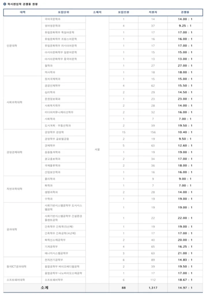 2021학년도 중앙대학교 학사편입 경쟁률은 14.97:1
