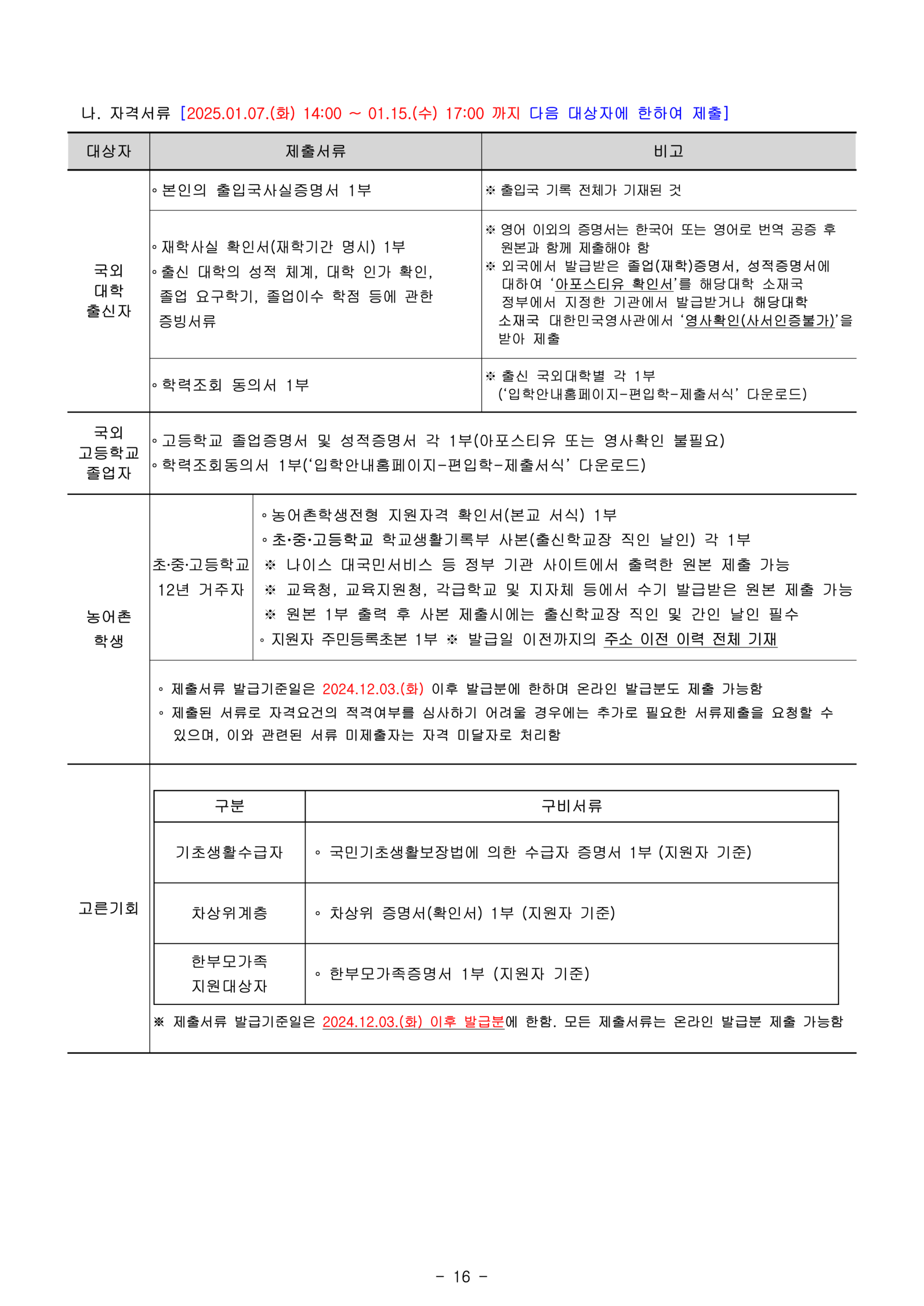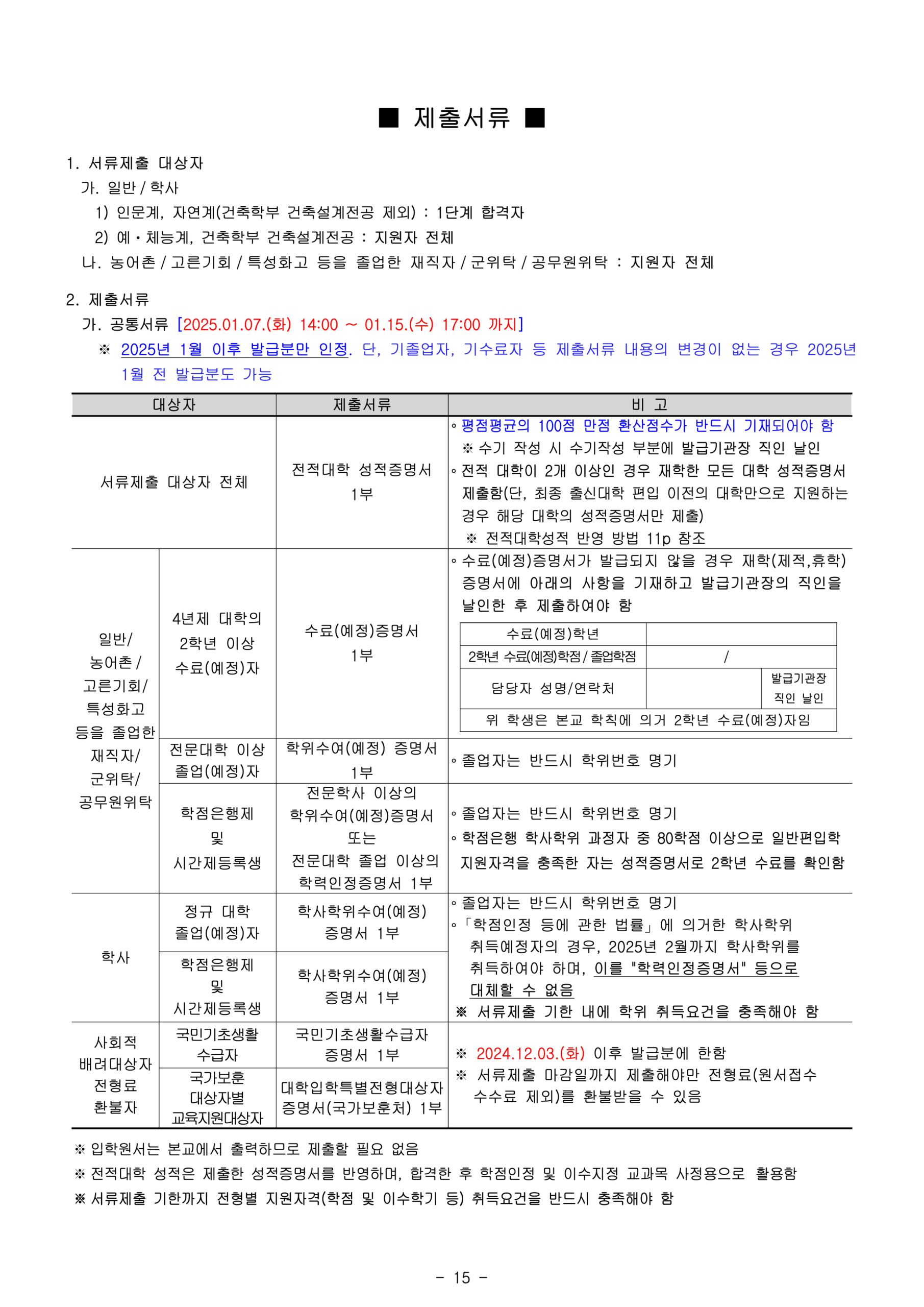 서류제출 | 2025. 1. 7 ~ 2025. 1. 15. | 등기우편 또는 방문 |